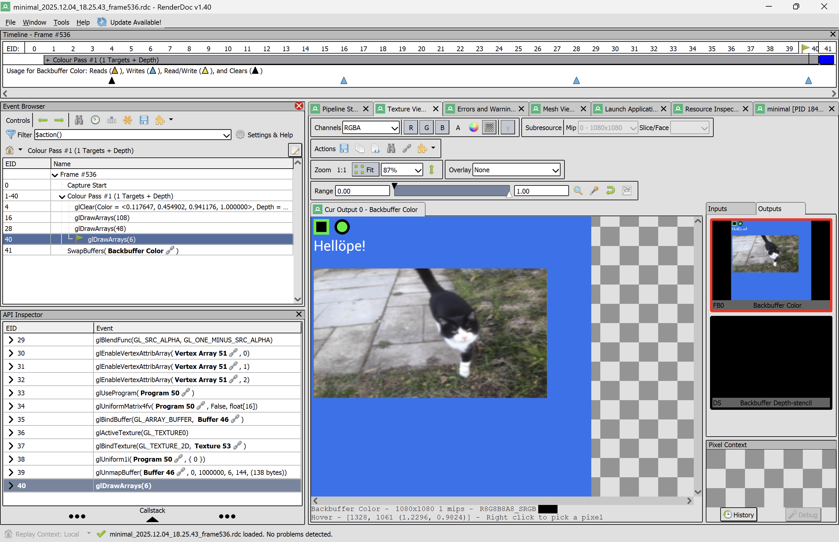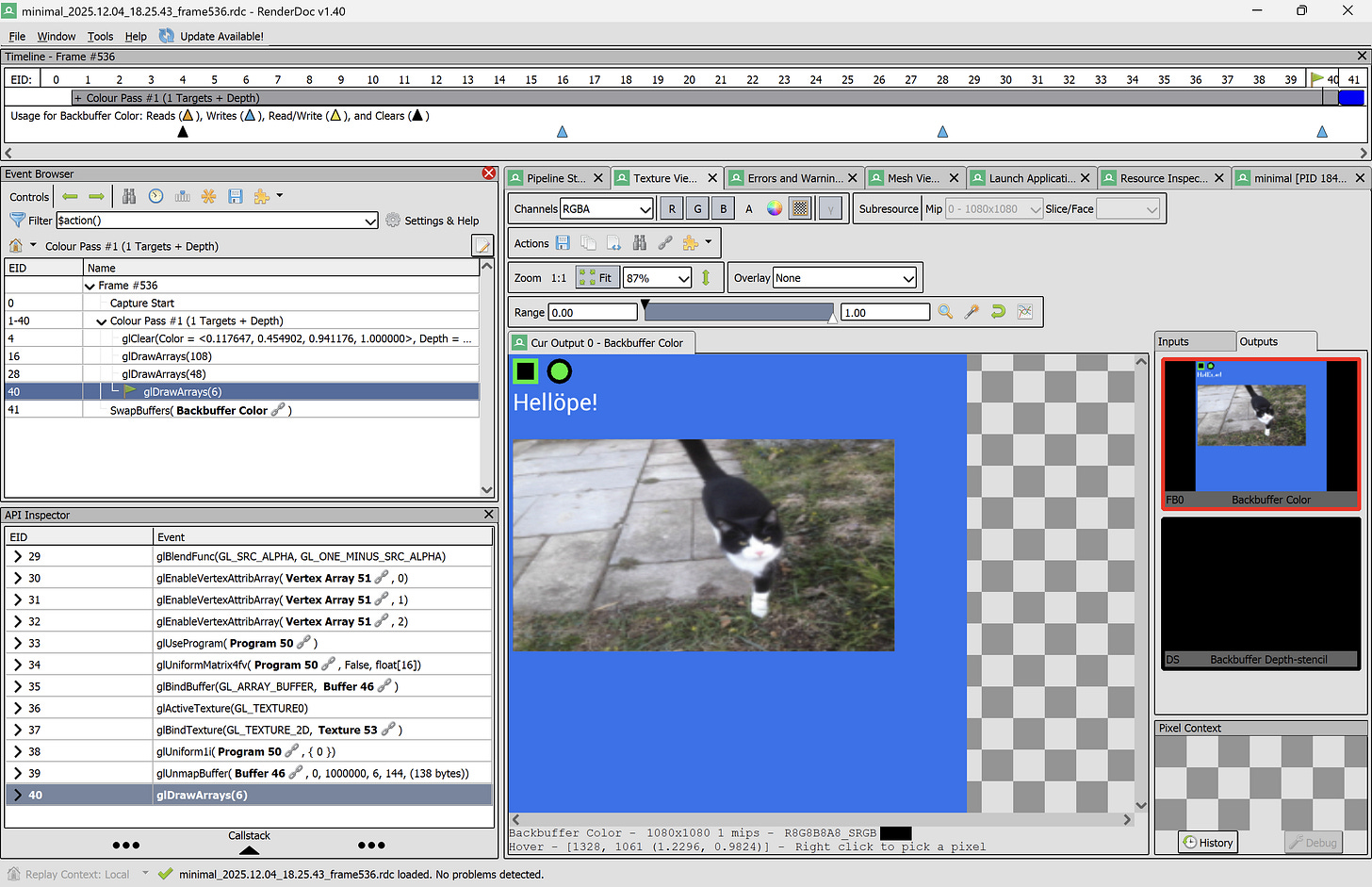 When implementing the OpenGL backend, a lot of my time was spent on staring at my D3D11 code and trying to come up with something similar in OpenGL. I often did it step-by-step. For example, when setting up the rendering of a draw call, I first got my data uploaded to the GPU. Before writing any more code, I used RenderDoc to check that the data had arrived to the GPU correctly. Then I added code for setting OpenG shaders, uniforms etc. At each step I tried to verify what I had done using RenderDoc. This made graphics programming a lot more fun! No more was it “write a lot of code and then debug it for 5 hours”. Instead it became: “Try to make your GPU do a bunch of tiny tasks and verify each step, if possible”. This made the code better. It often worked on first try.